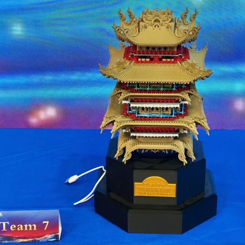 作品以黄鹤楼为原型,经数字建模而成,融合传统榫卯工艺与现代光影艺术。核心目标为实现夜间沉浸式效果,主体内置可遥控RGB彩灯,底座嵌入加湿器借丁达尔效应营造光影烟雾氛围。通过实践,麻豆影视系统掌握榫卯核心原理,探索传统建筑数字化转化路径,同时提升了项目统筹与全流程工程实践素养。