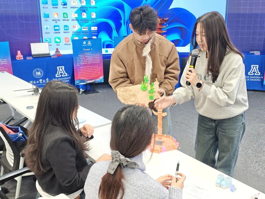作品以黄鹤楼为设计原型,团队全程独立建模,反复推敲校准整体框架与细节,精细化打磨屋顶形制、瓦片纹路等核心构造,还原传统工艺精髓。作品深度融入两校文化符号与精神内核,立面四面设代表性浮雕具象合作理念,最终3D打印模型兼具东方古典气韵与中外协同创新内涵,实现传统美学与现代设计统一。
